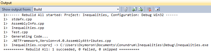 Go ahead now and click on Build > Build Solution. The compiler will now go and check that it has all the required files. The output window should now display the files that it checked; then it generates the code; and if it compiles then you get a succeeded note: