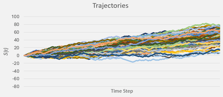 We accomplished this by going to the cells in our worksheet which held the Wiener increments and added in some additive noise. This resulted in a stochastic process (the coin flip stochastic process) with drift .