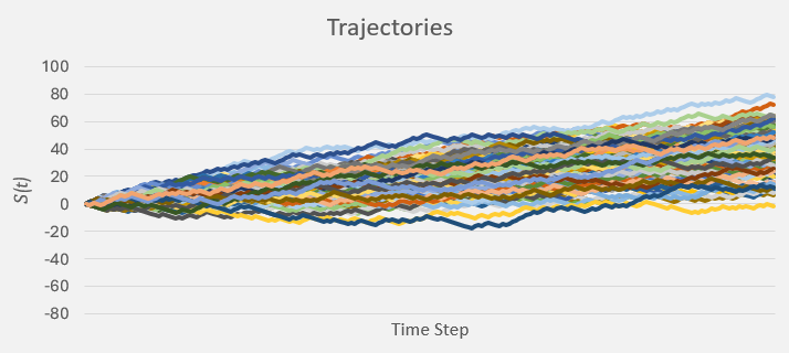 We accomplished this by going to the cells in our worksheet which held the Wiener increments and added in some additive noise. This resulted in a stochastic process (the coin flip stochastic process) with drift .