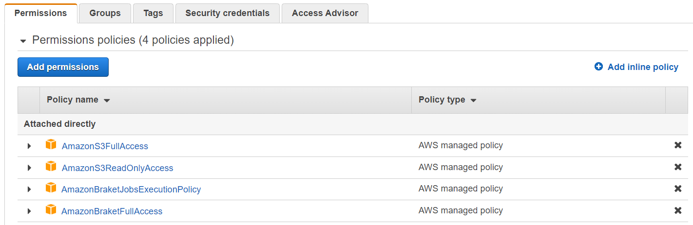 - Give your IAM user Amazon Braket Full Access & Job Execution permissions,