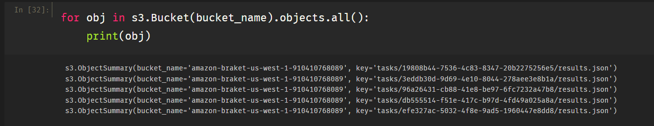 Now that we can access our quantum results using AWS S3 Buckets, let’s copy one of the bucket names from the previous step and assign it to the variable name key: