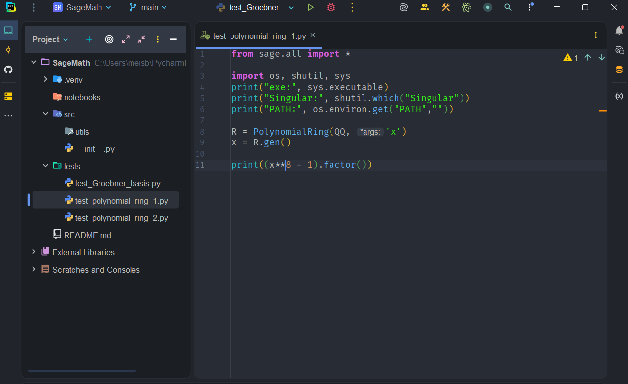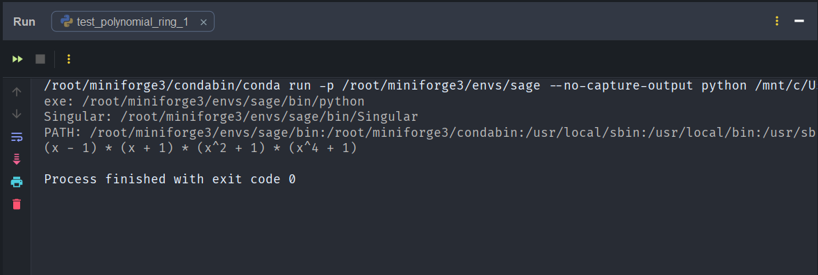 from sage.all import *import os, shutil, sysprint("exe:", sys.executable)print("Singular:", shutil.which("Singular"))print("PATH:", os.environ.get("PATH",""))R = PolynomialRing(QQ, 'x')x = R.gen()print((x**8 - 1).factor())