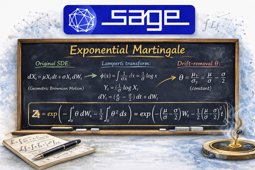 In the previous blog we introduced the Kolmogorov Forward and Backward equations and showed how they arise from the infinitesimal generator of a SDE. That exercise demonstrated that once the stochastic dynamics are expressed symbolically, SageMath can manipulate them in much the same way as classical calculus. In this post we extend that idea one step further. Instead of stopping at the Kolmogorov equations, we now show how the same symbolic representation of an SDE can be used to automatically construct the exponential martingale associated with the process. This object plays a central role in stochastic calculus because it forms the density process that enables changes of probability measure, ultimately leading to Girsanov’s theorem.