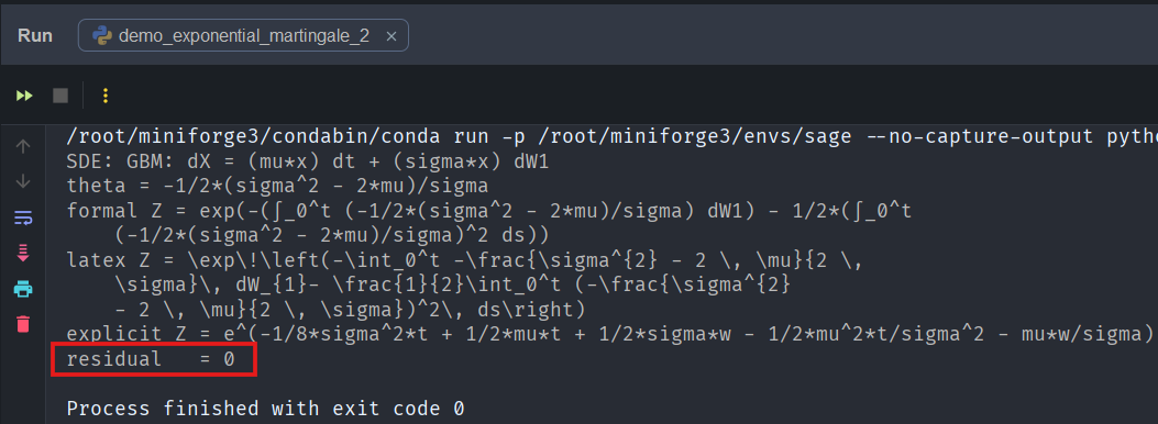 In other words, our symbolic engine verifies directly that the resulting process has zero drift, confirming that the stochastic exponential is indeed a martingale: