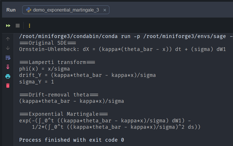 and, unlike the GBM case, we do not obtain a closed-form expression here because the drift-removal ratio is not constant. For that reason, this is not a case where we can apply the helper function verify_constant_theta. Instead, the significance of the OU test is that it shows that our symbolic framework is already capable of deriving a state-dependent drift-removal coefficient and substituting it directly into the formal stochastic exponential.