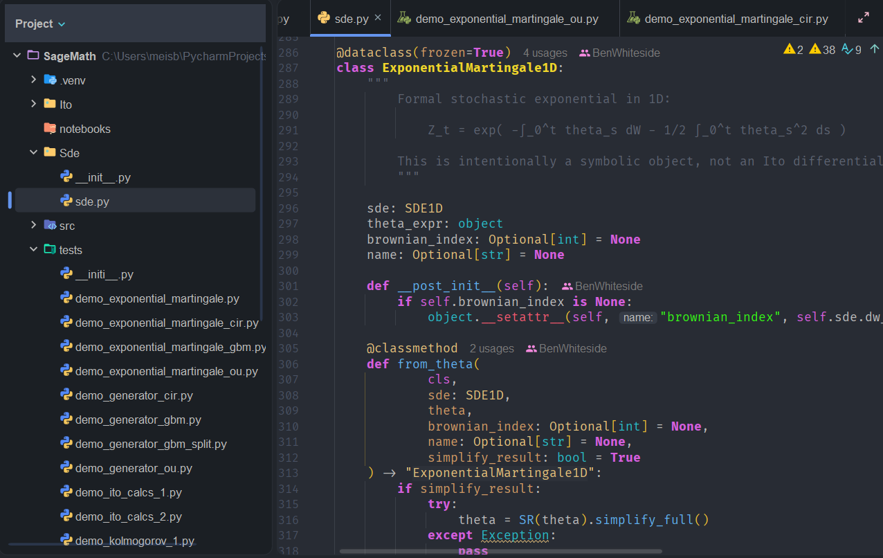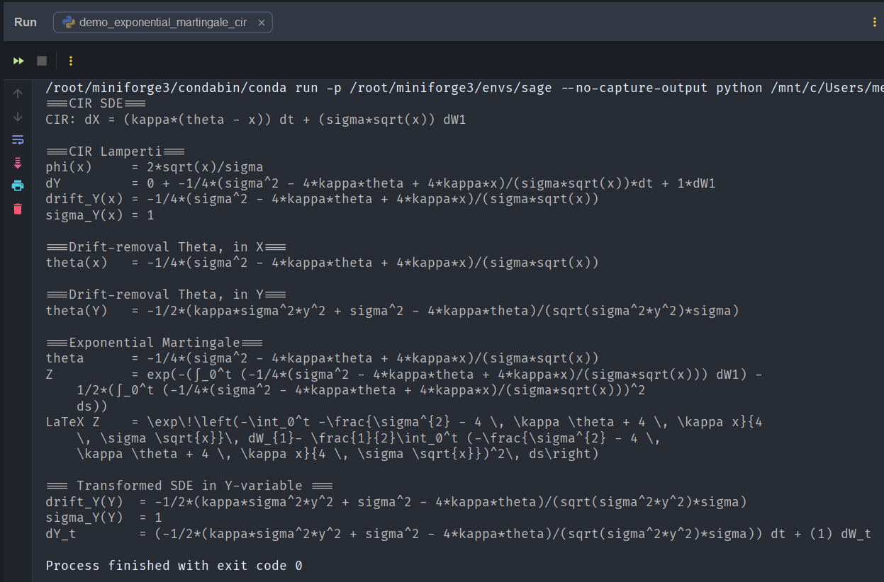 Taken together, the ExponentialMartingale1D class provides the final layer required to move from a symbolic SDE to its associated density process. It is this object that makes the bridge from the Lamperti-transformed dynamics to exponential martingales explicit in code.