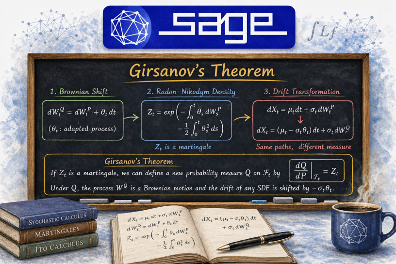 In the previous blogs we taught SageMath how to represent stochastic differential equations (as a data class), apply Ito’s lemma (as part of our Ito package), derive infinitesimal generators, and connect those generators to the Kolmogorov equations. We also introduced exponential martingales in the previous blog, and now, in this blog, that implementation will become useful because Girsanov’s theorem tells us how to change probability measure by reweighting paths, and in doing so, how to rewrite the drift of an SDE while leaving its diffusion term unchanged.