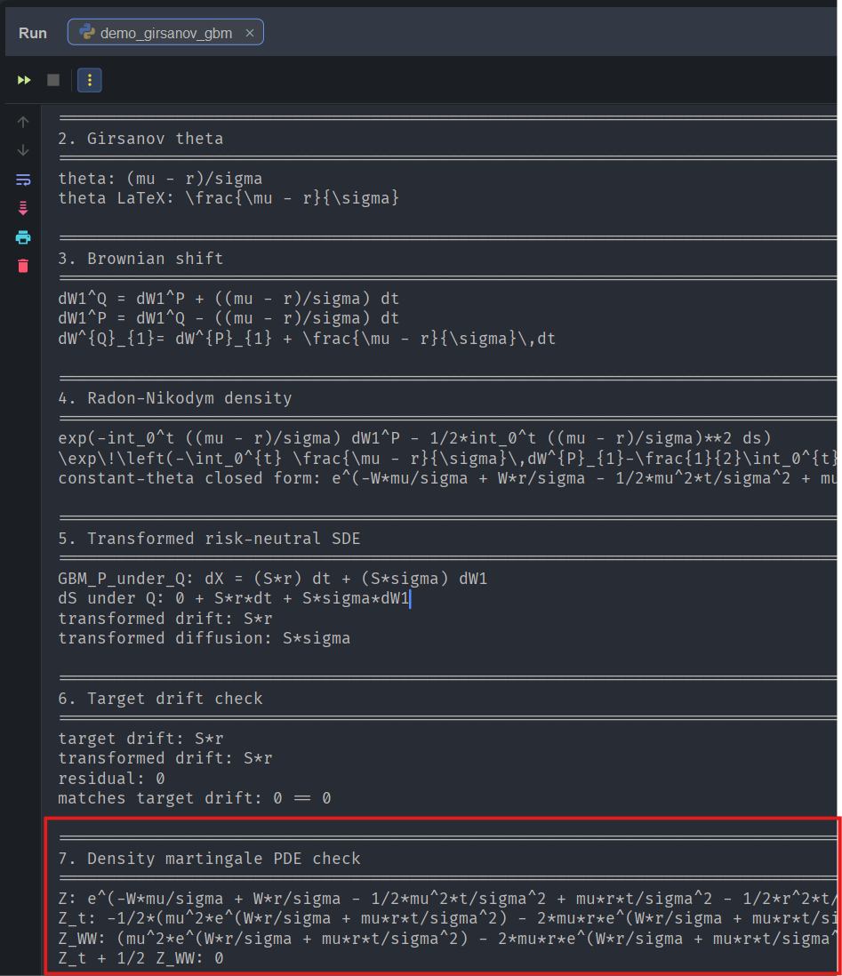 demo_girsanov_gbm.py test showing, among other things, that the solution satisfies the backward heat equation. This proves that the density process that SageMath derived symbolically is not just formal, but behaves exactly like a martingale should.Conclusion